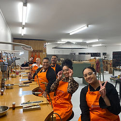Join us for a festive workshop experience. Get into the Christmas spirit by hosting your group of 18 people in our spacious and well-appointed workshop. There are a few dates available however if you are looking for a particular date, give us a call as we are happy to answer all queries to help make your Christmas get-together the best ever! Contact us to check date & time availability; Let us take care of the rest. Your group will create their own textured silver ring with the guidance of our skilled instructors, perfect for office groups, families, and friends. This popular hands-on session is designed to be supportive and fun, allowing your group to unleash their creativity. You can also create a ring in a Secret Santa draw; so you'll never know which "Elf" made your beautiful textured ring! There are some options for your group of 18, to come & enjoy: 1. The standard class with tea, coffee & biscuits: $1620 (90 pp) 2. With a shared Simple Tea: $1800 (100 pp) 3. With a delicious shared Messe Table: $2070 (115 pp) Don't miss the opportunity to craft something special with your group and make your end of year activities a memorable one with The Jewellers Collective! Please note: Our Health and safety induction is designed to keep you informed & safe during your time at the workshop. You must wear closed toe shoes eg: sneakers, & have any long hair tied up. Bring your eyeglasses if you need to see up close.